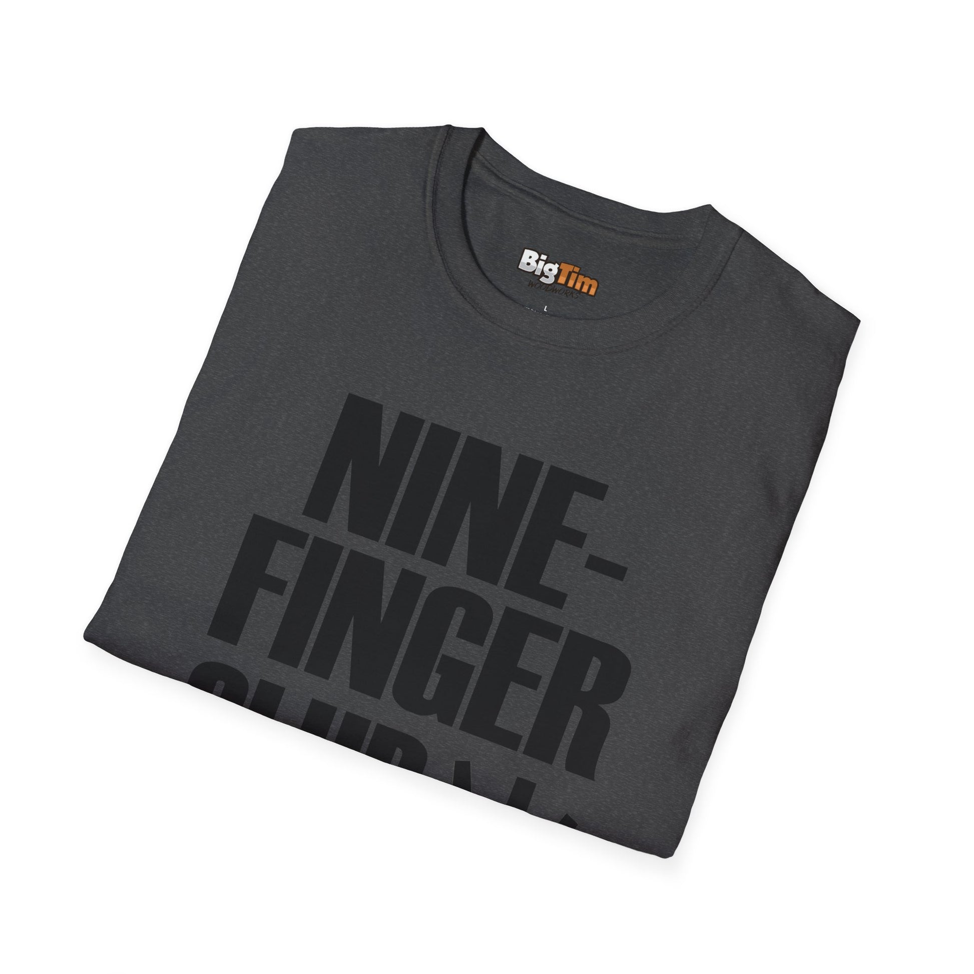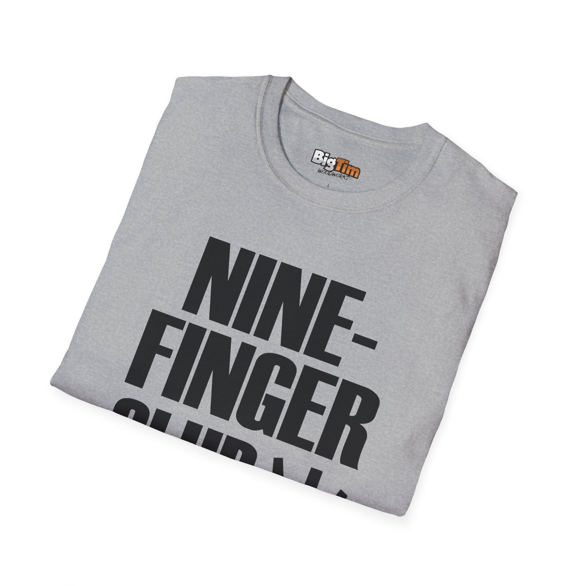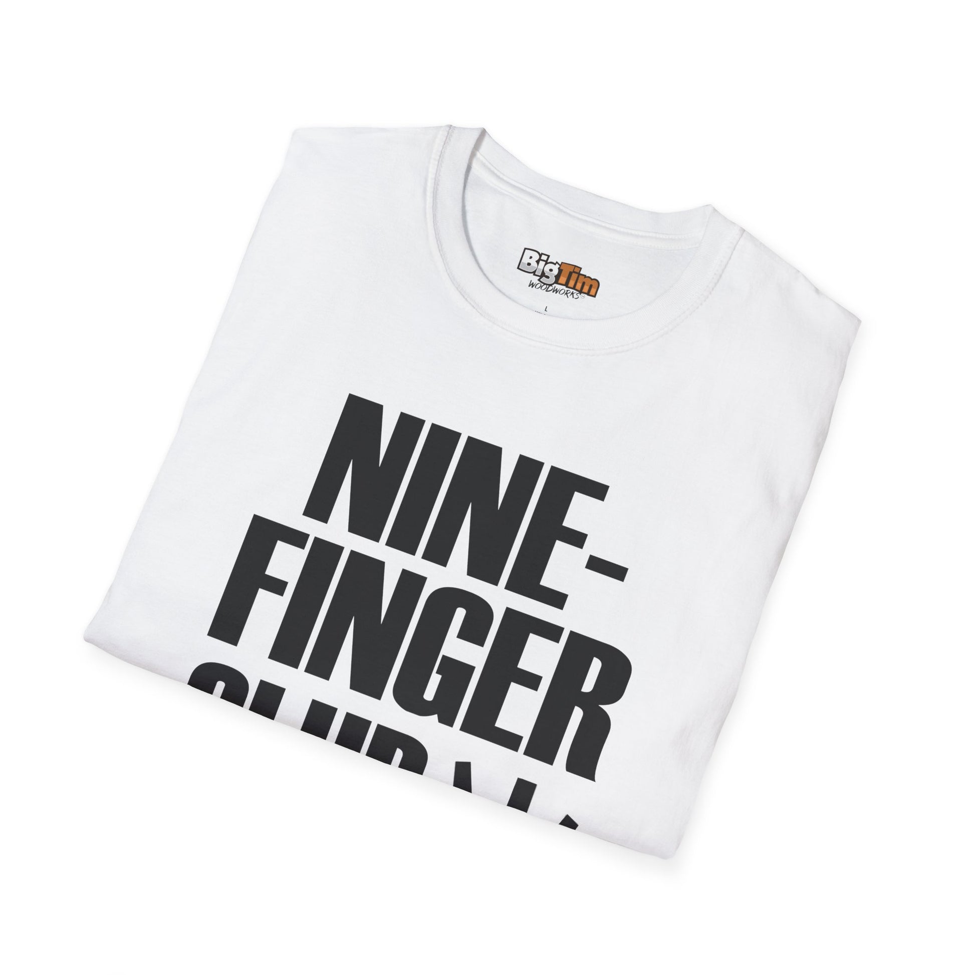 This unisex softstyle T-shirt features a funny image showing the wearer as a member of the nine-finger club, designed for woodworkers, carpenters, mechanics, construction workers, or those who play hard. It provides a comfortable fit and versatile style for any occasion.